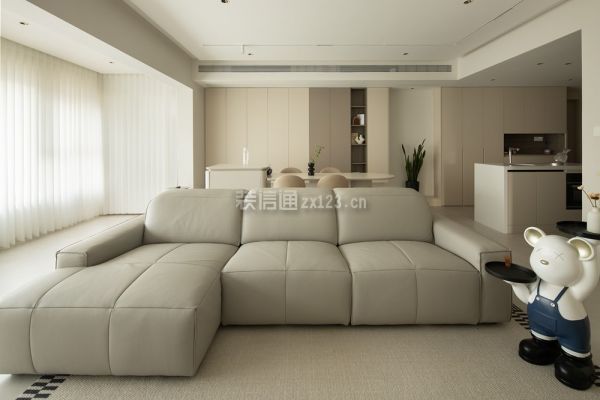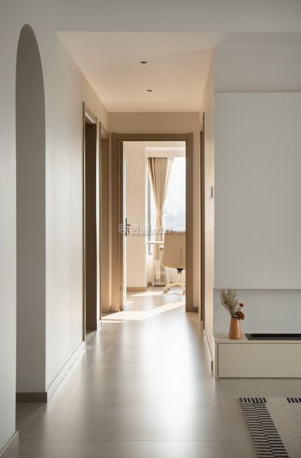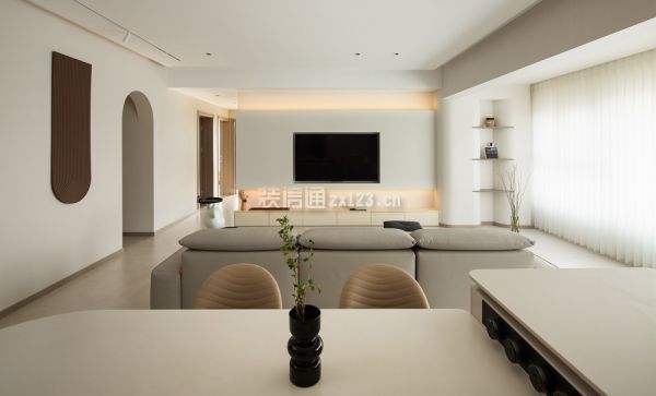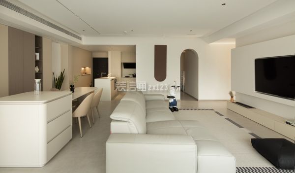 2、客厅装修:干净透彻的颜色,利落舒爽的线条是客厅给人最深刻的印象,素雅白构建了纯洁的基调,少量棕色装饰和黑色线条点缀其中,增添活跃之感。无主灯设计为顶部空间减少赘饰,悬浮吊顶增加纵向延伸感。从进门到阳台,6.5m长的距离几乎全做了储物柜设计,仅在中间部分打造了一个展示格,用绿植打造出中线端景。“l”型镂空让靠近阳台一侧的柜体悬空,部分木格栅造型柜门、开放式展示柜穿插其中,避免了全是柜门带来的沉闷。5.3m长的景观阳台尽数纳入客厅,为了让更多自然光进入家居空间,客厅的窗帘选用了轻薄的白纱梦幻帘,光倾洒入客厅,没有墙体的阻碍,随着空间的延展在家中蔓延。翻一本好书,看一场电影,与家人靠在软牛皮沙发上,或是就着柔软的地毯席地而坐,享受温柔平静的亲子时光。悬浮电视背景墙将电视完美内嵌,插座、网络接入口、机顶盒等物件巧妙纳入下方的地台柜中。从侧面看无凸出部分,没有杂乱的电线露出,高级感满满。乳白色定制地台柜代替了传统的电视柜,加装的雾化壁炉可以在冬日里为这个清冷的空间增添一丝暖意,橘红色的壁炉灯光与嵌在电视背景墙边缘的暖色灯带交织成落日余晖的画卷。既是为了包裹阳台落水管,也是为了弱化上方梁的存在感、增添柔和之意,阳台的展示柜的圆弧造型延伸至梁的位置,吊顶也采用了立面弧形吊顶。木作弧形造型预留凹槽,形成独特的内龛造型展示柜,三层褐色的隔板可以放些精致摆件,也与进门整墙储物柜开放格的隔板材质一样,点对点的呼应让整体氛围更为和谐。家政间仅做了拱形门洞,开放式的格局增添过道的通透感,这种自由的呼吸感自客厅发散到其他几个空间。一侧墙面用倒立拱形的棕色壁画打破大白墙的沉寂,在造型上和门洞相呼应,趣味十足。