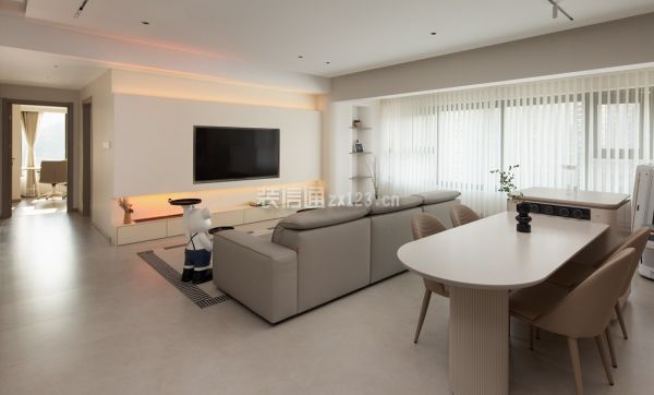 3、餐厅装修:ldk一体化设计打破常规,让客、餐、厨三个空间融为一体,奶白色铺满整个大空间,利落齐平的线条展现规整感的同时形成了过道,区分不同的功能区。从广东定制的餐岛一体式餐桌造型独特,用料讲究。轨道插座增加了生活的便利性,卫生程度也比地插高。圆弧的餐桌边角线条、实木台面的温润质感中和了阳角和储物柜体的凌厉。上方轨道射灯和筒灯作为餐厅的光源,灯光效果可调节,下方鹅卵石点缀在悬空柜体之下,就餐氛围轻松拿捏。
