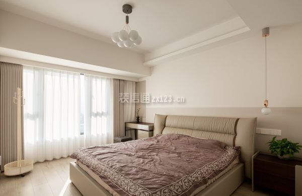 5、主卧装修:主卧的延续简洁大方的设计思路,布局方正,色系使用与公区一致,但增添了更多粉调颜色的使用,营造出静谧安宁之感。卧室的地面均用强化木地板代替了瓷砖,木元素的搭配碰撞出家的温暖,温度就在脚下。进入休息区域的两侧墙体均做了定制柜体,打造出步入式衣帽间,超大储物空间让夫妇二人均有属于自己的衣柜,同时也是进入更私密区域的一个缓冲地带。靠窗一侧的床头柜用梳妆台代替,金属的表面材质增添时髦气息,拆掉飘窗之后的空缺用内嵌储物柜填满,台面放不下的东西便可以存在其中。